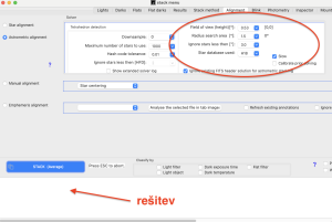 V orodni vrstici kliknite na zavihek Stack menu. Odprlo se bo novo okno. Kliknite na alignment. Na levi strani okna izberite možnost astrometric alignment. V osrednjem delu okna imate t. i. solver, v katerem boste morali spremeniti parametre (slika 8.4). Pomembno je spremeniti predvsem velikost vidnega polja slike in radij iskanja. Izberite zvezdni katalog, ki ste si ga prej prenesli na računalnik.