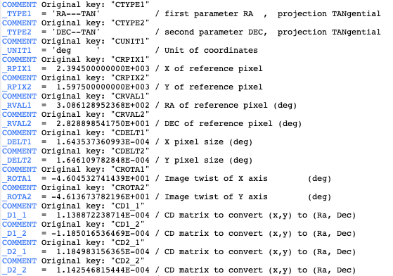 Ko želimo posneti sliki poiskati astrometrično rešitev, običajno to naredimo tako, da zvezde na sliki primerjamo z obstoječim katalogom. V pomoč so nam različni programi, v nadaljevanju si bomo pogledali dva: astrometry.net in ASTAP. Programi se iskanja astrometrične rešitve običajno lotijo tako, da na sliki najprej poiščejo vse (svetle) zvezde in nato primerjajo relativne razdalje med zvezdami oziroma vzorec s katalogom. Ko najdejo rešitev, jo zapišejo v glavo slike FITS (slika 8.2), kjer jo program za odpiranje slik lahko prebere.