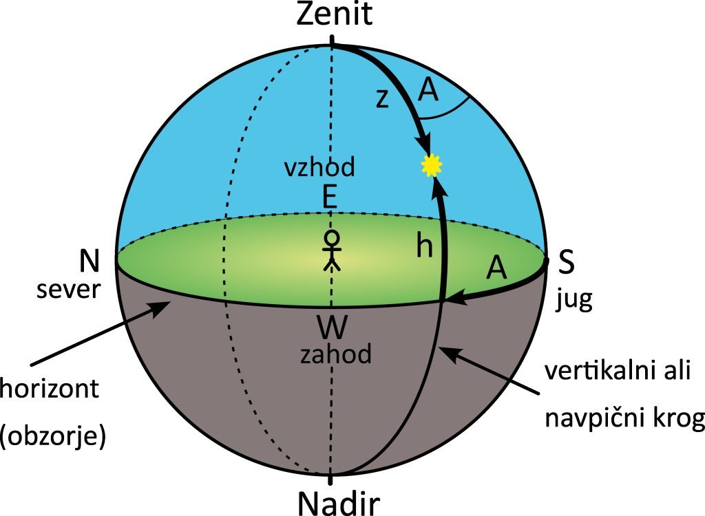 Ozrimo se navpično navzgor. Točko na nebesni krogli točno nad nami imenujemo zenit (tudi nadglavišče). Sedaj se ozrimo navzdol — točko točno pod nami imenujemo nadir (tudi podnožišče). Za orientacijo na horizontu označimo smeri neba, pri čemer običajno uporabljamo angleško notacijo (N za sever, S za jug, E za vzhod in W za zahod).