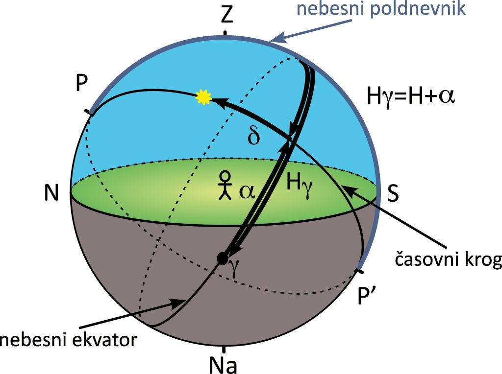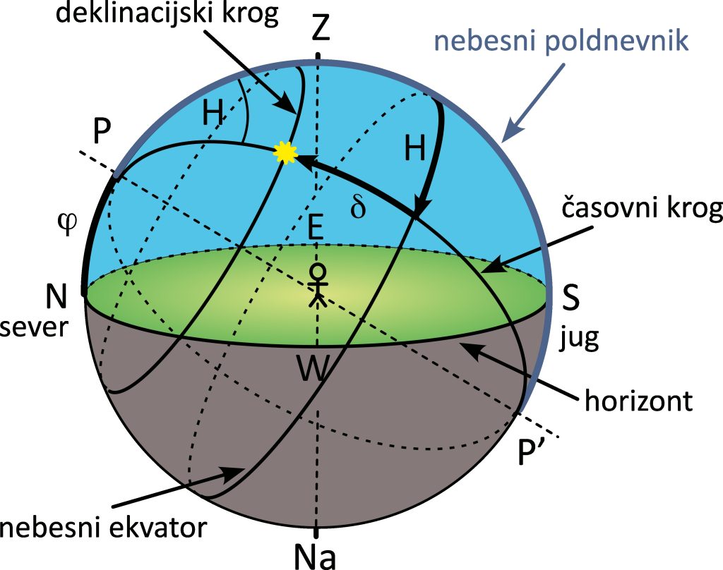 Postavili smo ogrodje horizontnega koordinatnega sistema. Ta sistem je odvisen od opazovališča (slika 2.7) in ni fiksiran na zvezde, zato se zaradi vrtenja in gibanja Zemlje koordinate zvezd v njem s časom spreminjajo. Ne samo to, položaj iste zvezde je v istem trenutku za opazovalce in opazovalke na različnih krajih Zemlje različen. S katerima koordinatama pa bi v tem sistemu lahko opisali položaj točke (zvezde ali drugega telesa) na nebu?