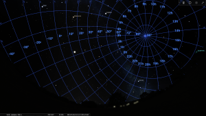 Tako bi bil videti ekvatorski koordinatni sistem na nebu (če bi na njem narisali kroge s konstantnimi deklinacijami in rektascenzijami). Mreža izhaja iz severnega nebesnega pola, ki je zelo blizu Severnice. Krogi označujejo položaje na nebu z isto deklinacijo, črte položaje z isto rektascenzijo. Mreža je narisana s programom Stellarium. Odprite program in tudi vi narišite mrežo nad vašim nebom. Na zaslon dodajte še azimutni koordinatni sistem. Poglejte, kako se s časom spreminja položaj zvezd glede na oba koordinatna sistema.
