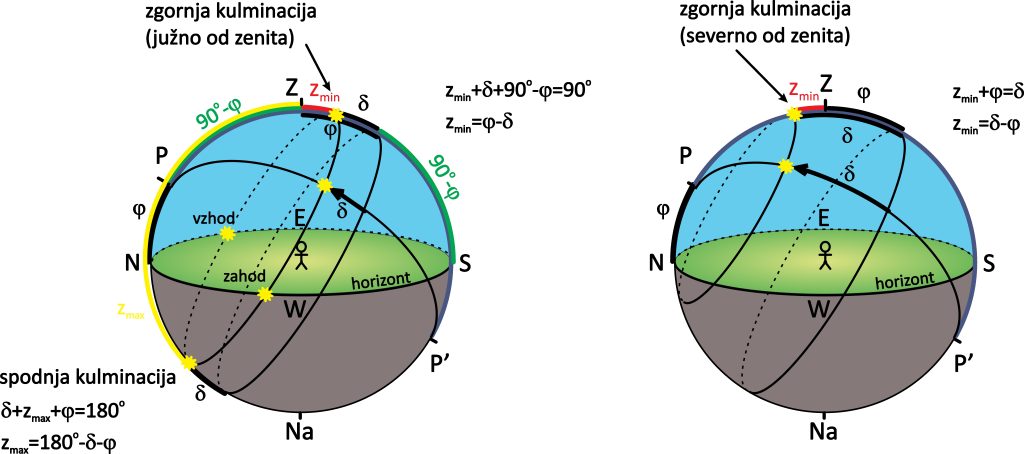 Skici na sliki 2.11 prikazujeta dva primera zgornje kulminacije zvezde glede na zenit — zvezda kulminira južno ali severno od zenita, kar je odvisno od deklinacije zvezde in zemljepisne širine