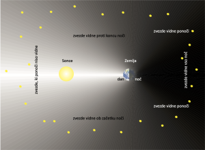 Katere zvezde so vidne na nočnem nebu, je odvisno od položaja Zemlje glede na Sonce (slika 2.13). Sonce oddaja veliko svetlobe, ki se siplje na molekulah in delcih Zemljinega ozračja. Posledično je čez dan nebo tako svetlo, da šibkih nebesnih teles na njem ne vidimo. Zato zvezd, ki so nad obzorjem podnevi, ne vidimo. Vidimo le tiste zvezde, ki so nad obzorjem opazovališča ponoči.