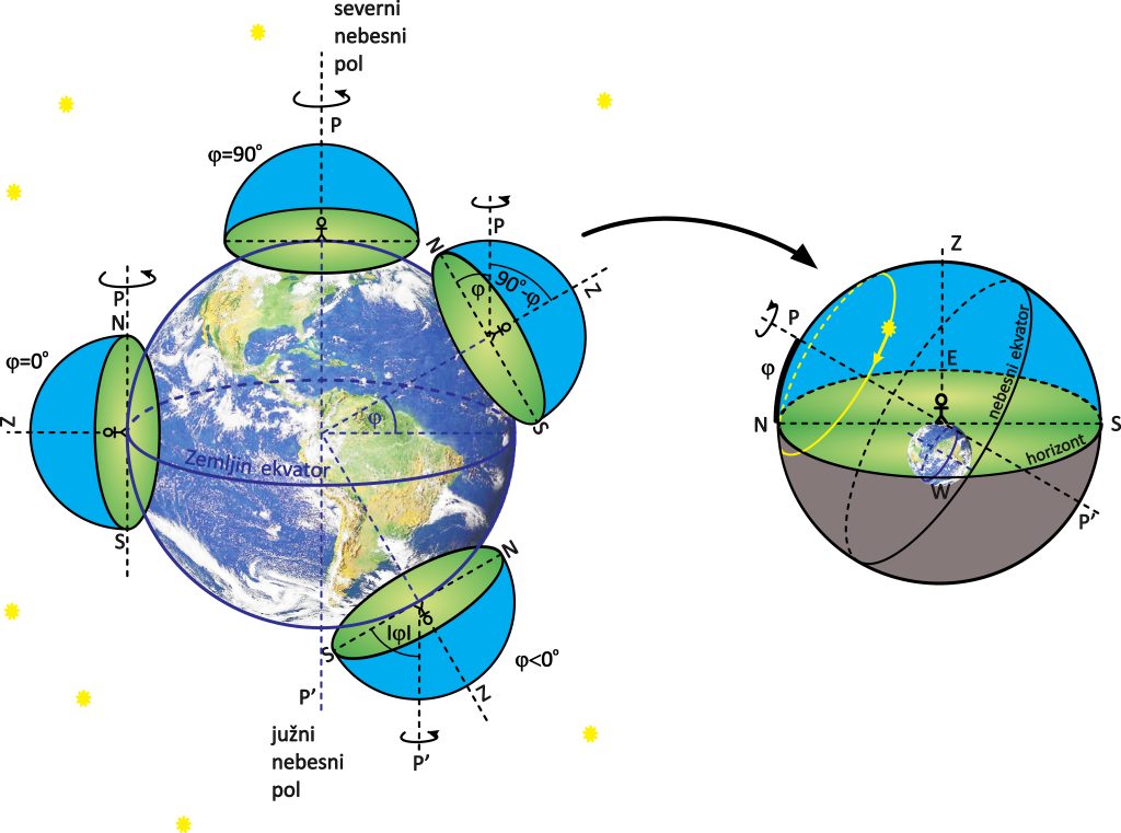 Na sliki 2.7 vidimo različna opazovališča. V opazovališču na Zemljinem severnem polu (zemljepisna širina ) je severni nebesni pol v zenitu, njegova višina je torej