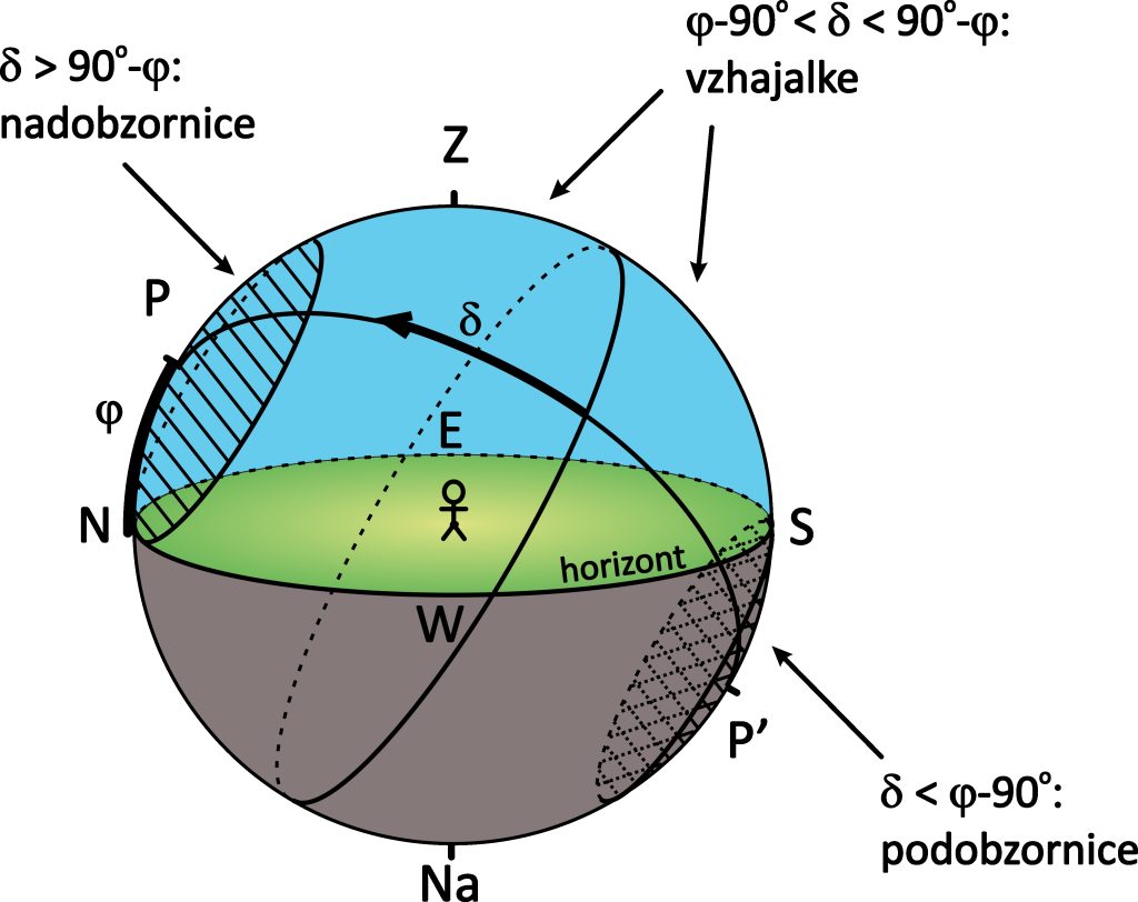 - nadobzornice ali cirkumpolarne zvezde – zvezde, ki nikoli ne zaidejo;