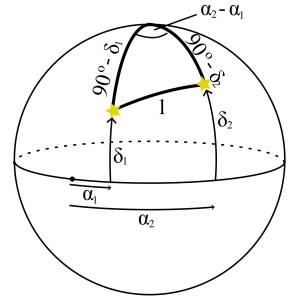 Pogosto nas zanima, kolikšna je kotna razdalja med dvema telesoma na nebu. Prvo telo naj ima koordinate
