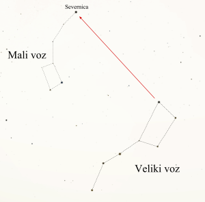 Iskanje telesa na nebu je podobno iskanju mesta na zemljevidu. Večja mesta na že znanem delu zemljevida najdemo brez težav: poiščemo znani vzorec, kot je na primer italijanski škorenj, se po njem orientiramo in najdemo iskani kraj. Podobno nam pri orientaciji po nebu pomagajo znani vzorci svetlih zvezd. Na primer, da želimo poiskati zvezdo Severnico (slika 2.1). Najprej poiščemo Veliki voz, enega izmed najopaznejših vzorcev zvezd (sam Veliki voz ni ozvezdje, pač pa je del ozvezdja Veliki medved). Dolžino prednje stranice približno petkrat podaljšamo navzgor in tako pridemo do repa Malega voza oziroma Severnice. Zvezdnato nebo postane z nekaj izkušnjami tako domače, da se na njem znajdemo brez težav in najdemo iskane zvezde.