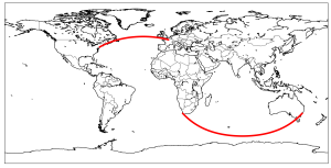 Najkrajšo razdaljo med dvema točkama na krogli dobimo, če ju povežemo z lokom velikega kroga. Zemlja je okrogla, zato na 2D projekciji, ki se uporablja največ (t. i. Mercatorjevi projekciji), najkrajša razdalja med dvema mestoma ni ravna črta. Na spodnjem zemljevidu rdeči krivulji označujeta najkrajši razdalji med Parizom in New Yorkom in med Cape Townom in Sydneyjem. Zemljevid je bil narisan z orodjem Basemap.