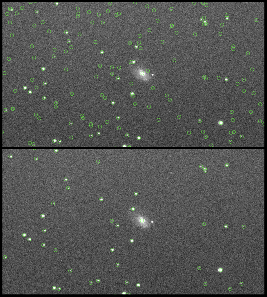 Vsak krožec je eno izmed teles. Najprej preverimo svetle zvezde: jih krožci pokrijejo? V našem primeru jih, kar pomeni, da je astrometrična rešitev slike dobra. Če bi opazili neujemanje, bi bila to lahko posledica slabe astrometrične rešitve (dobro je tudi preveriti, ali morda koordinate v katalogu niso v drugem koordinatnem sistemu). Na naši sliki opazimo, da je krožcev veliko več kot zvezd na sliki. Razlog je, da naša slika nima dovolj dolge osvetlitve, da bi na njej lahko videli tudi temnejše zvezde, ki so v izbranem katalogu.
