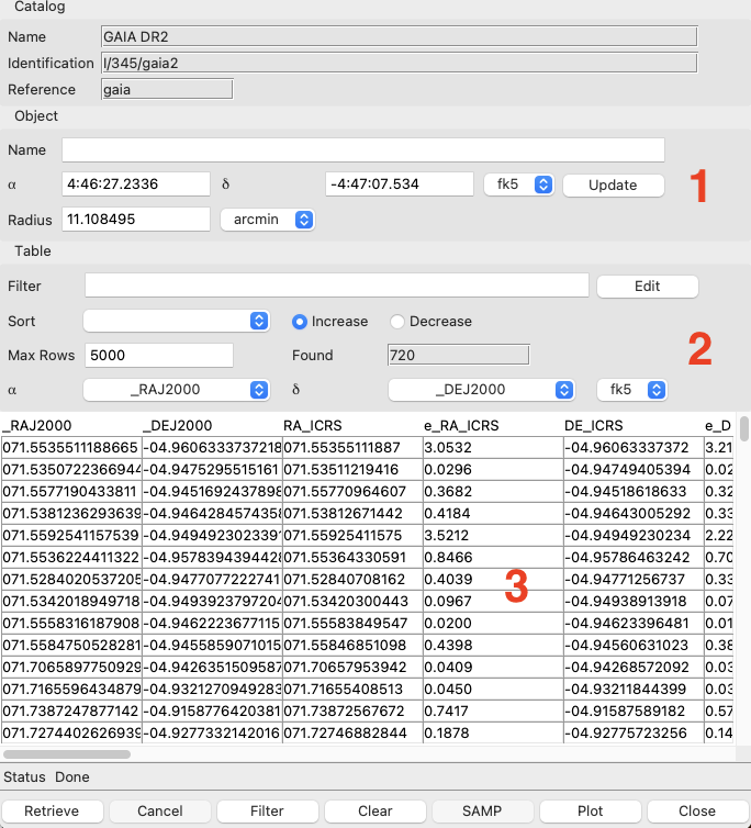 Sliko z astrometrično rešitvijo (več o astrometriji v poglavju Astrometrija) lahko primerjamo s katalogi. Ko imamo naloženo sliko, v glavnem meniju na vrhu okna izberemo Analysis, nato Catalog in nato Optical. Dobimo seznam katalogov (druge kataloge lahko uporabnik doda tudi sam) in kliknemo na želenega. Recimo, da izberemo katalog Gaia DR2, ki vsebuje položaj več kot milijarde zvezd v Galaksiji. Odpre se novo okno (slika P19).