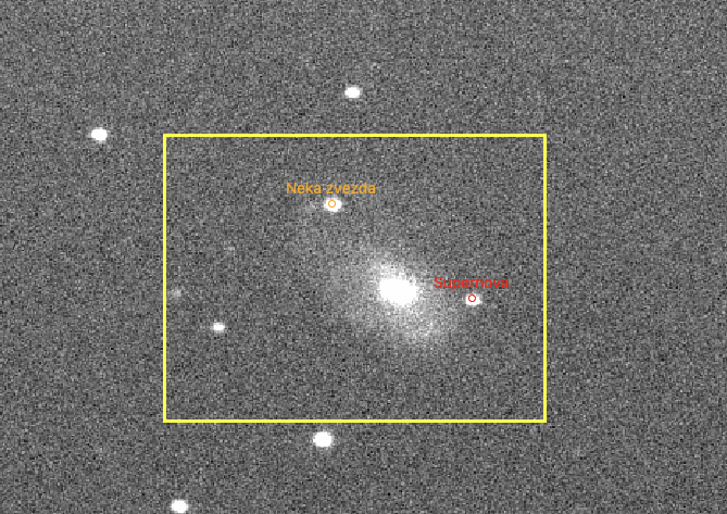 Pozorna bralka ali bralec bo na sredini slike opazil relativno svetlo zvezdo, ki je ni v katalogu. To je eksplozija supernove. Tovrstnih tranzientnih pojavov v katalogih zvezd ni.