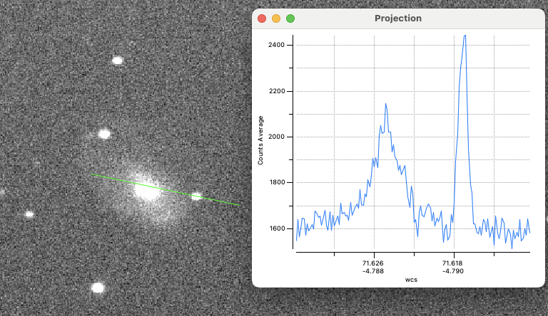 Program SAOImageDS9 ima preprost način pregledovanja porazdelitve signala. Kliknite na Region, nato Shape in Projection. Tako kot prej v polju 4 glavnega okna kliknite region in še Region v spodnji vrstici. Z miško potegnite čez del slike, za katerega želite izmeriti porazdelitev signala. Odprlo se bo novo okno s porazdelitvijo — primer je prikazan na sliki P22.