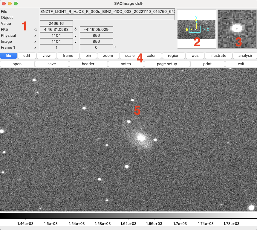 - Osnovne informacije o sliki. Na vrhu je zapisano ime naložene slike, na dnu številka naložene slike (Frame) — naenkrat je lahko naloženih več slik. Če greste z miško čez sliko, se bo zapisala tudi vrednost signala na trenutnem pikslu, številka vrstice in stolpca piksla ter, če ima slika astrometrično rešitev, tudi ekvatorske koordinate piksla.