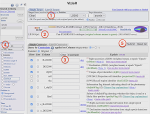 Recimo, da delamo fotometrične meritve (glej poglavje Fotometrija). Zanima nas navidezni sij zvezd na sliki, saj bomo te podatke uporabili za umeritev sija našega telesa (npr. zvezda z eksoplanetom, spremenljiva zvezda, supernova). Eden izmed katalogov, v katerem so zbrane fotometrične meritve, je katalog velikega pregleda neba Pan-STARRS. Na spletni strani Vizier v iskalno polje vpišemo Pan-STARRS. Iskalnik najde en sam zadetek, katalog II/349/ps1. Ob rezultatu kliknemo na ikonico Vizier in prišli smo do iskanega kataloga.