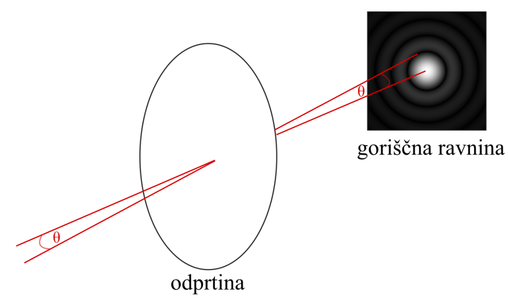 V začetku 19. stoletja so opazili, da slika, ki jo pri opazovanju svetle zvezde ustvari teleskop, ni točka, kot bi morda naivno pričakovali. Namesto svetle točke so videli majhen svetel disk, obkrožen z več koncentričnimi kolobarji (slika 6.3). Osrednji disk imenujemo Airyjev disk, po Georgeu Biddellu Airyju, ki je prvi pojasnil pojav. Airyjev disk in obroči so preslikava okrogle odprtine na goriščno ravnino (odprtina drugačne oblike preslika točko v drugačen vzorec), kar je posledica uklona svetlobe.