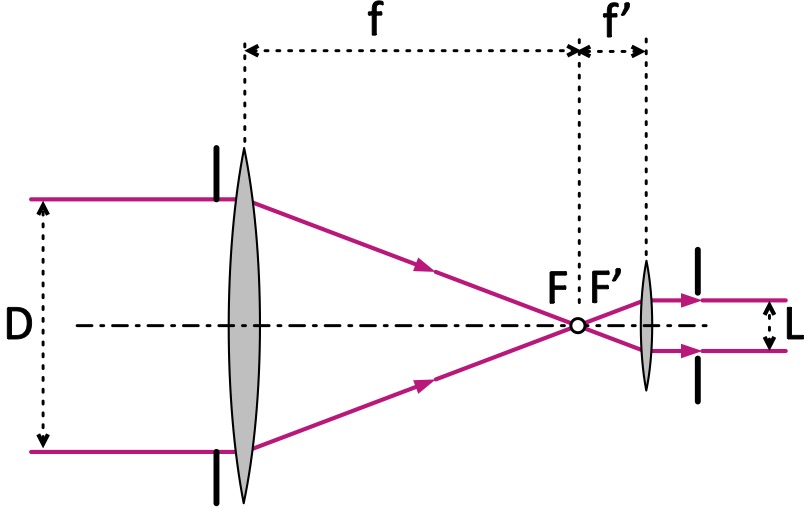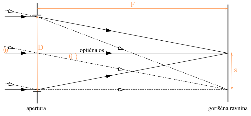 Koncept nastanka slike, ki jo daje objektiv, je prikazan na sliki 3.2. Privzemimo, da opazujemo dve točkasti telesi, ki sta na nebu za kot narazen. Za astronomsko opazovanje lahko privzamemo, da so opazovana telesa neskončno daleč in da so žarki svetlobe, ki prihajajo z vesoljskih teles v teleskop (telesa jih bodisi oddajajo bodisi odbijajo), med seboj vzporedni[2].