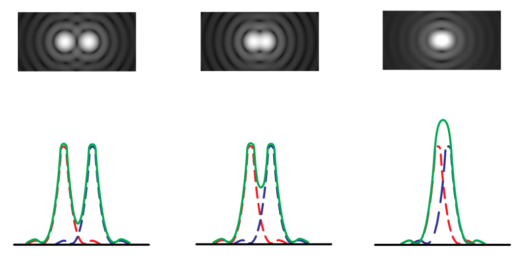 Velikost Airyjevega diska vpliva na ločljivost teleskopa. Ločljivost pove, kolikšna mora biti razdalja med dvema točkama na nebu, da ju še vedno lahko razločimo na sliki. Odprtina dve točki na nebu preslika v dva Airyjeva diska s pripadajočimi obroči. Dve točki na nebu še lahko razločimo, če vrh Airyjevega diska prve točke pade na temno mesto med vrhom drugega Airyjevega diska in njegovim prvim obročem — glej sliko 6.4.