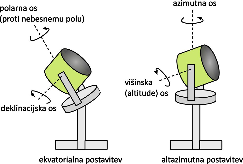 Na sliki 6.9 sta prikazani dve postavitvi teleskopov, ki se uporabljata v praksi, in sta povezani z dvema osnovnima koordinatnima sistemoma, ekvatorskim in horizontnim.