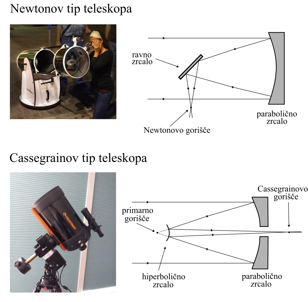 Newtonov tip teleskopa je priljubljen med ljubiteljskimi astronomi in astronomkami, a postane za večje teleskope nepraktičen. V večjih teleskopih postavijo v primarno gorišče (hiperbolično ali parabolično) zrcalo, ki svetlobo odbije v sekundarno gorišče, kamor postavimo instrument ali kamero. Takšen tip teleskopa je priljubljen tudi zato, ker omogoča veliko goriščno razdaljo kljub majhni dolžini teleskopa.